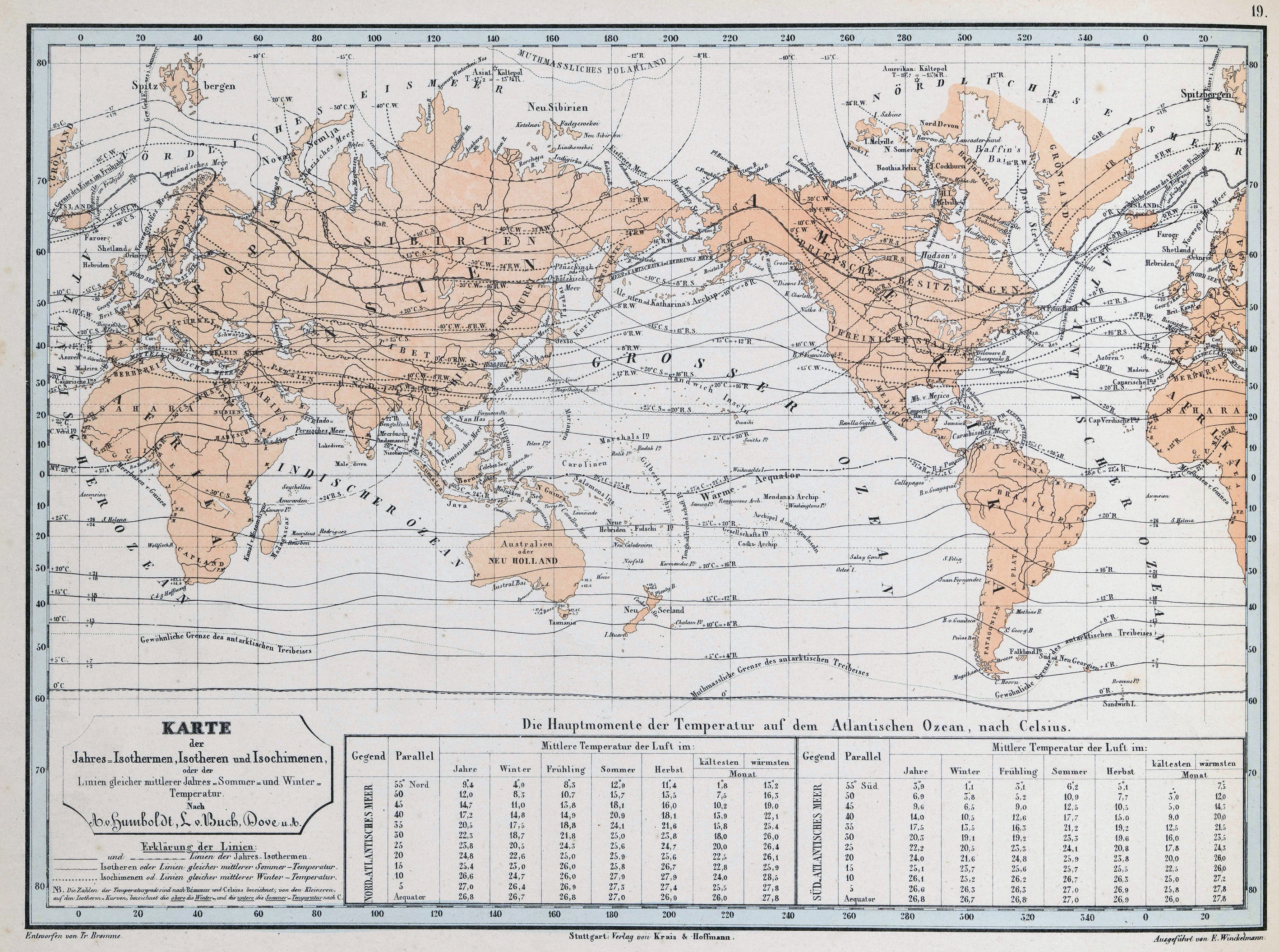 * Eine Weltkarte nach Humboldt der Isothermen (Linien gleicher Temperatur), Isotheren (Linien gleicher durchschnittlicher Sommertemperatur) und Isochimenen (Linien gleicher durchschnittlicher Wintertemperatur) findet sich hier).